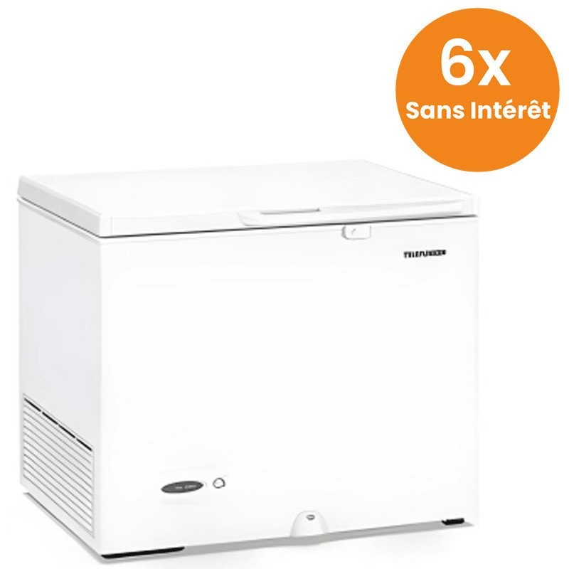 Congélateur Horizontal TELEFUNKEN - Volume Nette: 200 Litres - Capacité de congélation: 15.5Kg/24H - Congélation rapide - Classe climatique: ST (18°C à 38°C) - Nombre d'étoiles: 3 - Mode de dégivrage: Manuel - Ouverture de porte vers le haut - Consommation annuelle moyenne: 213 KWh - Niveau sonore: 42 dB - Dimensions: 905 x 545 x 845 mm - Couleur: Blanc - Garantie: 3 ans