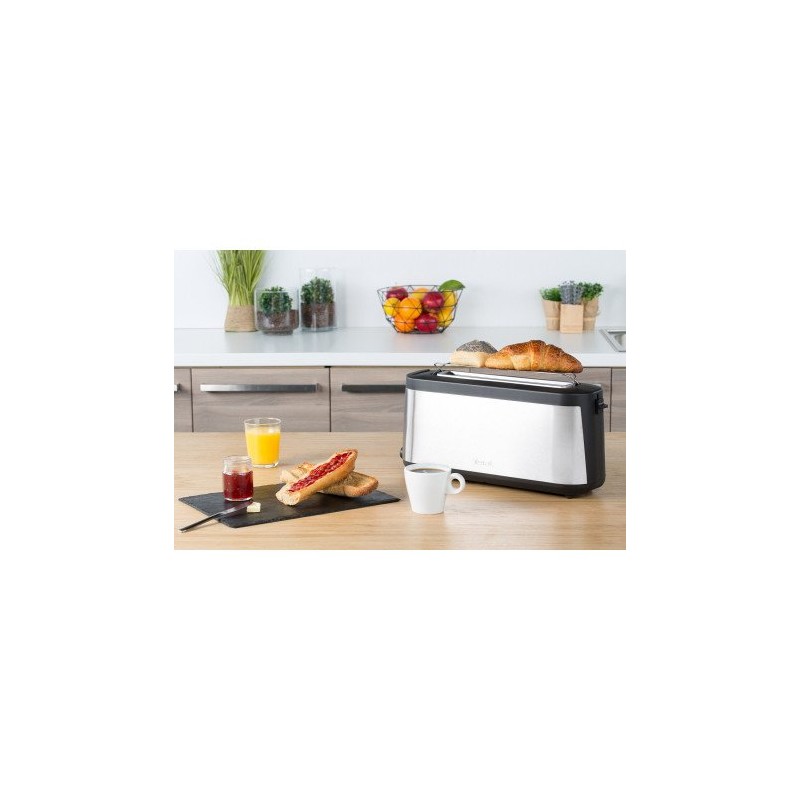 Grille Pain TEFAL - Puissance: 1000 Watts - 1 fente longue - 4 fonctions: Décongelation, Réchauffage, Stop, Baguette - Thermostat 7 positions réglables - Centrage automatique du pain pour griller uniformément - Support viennoiseries intégré - Ramasse-miettes amovible - Couleur: Inox